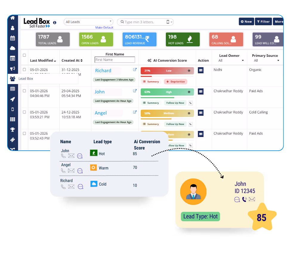 Engage prospects and customers across WhatsApp, Calls, Email & SMS—without switching tools.