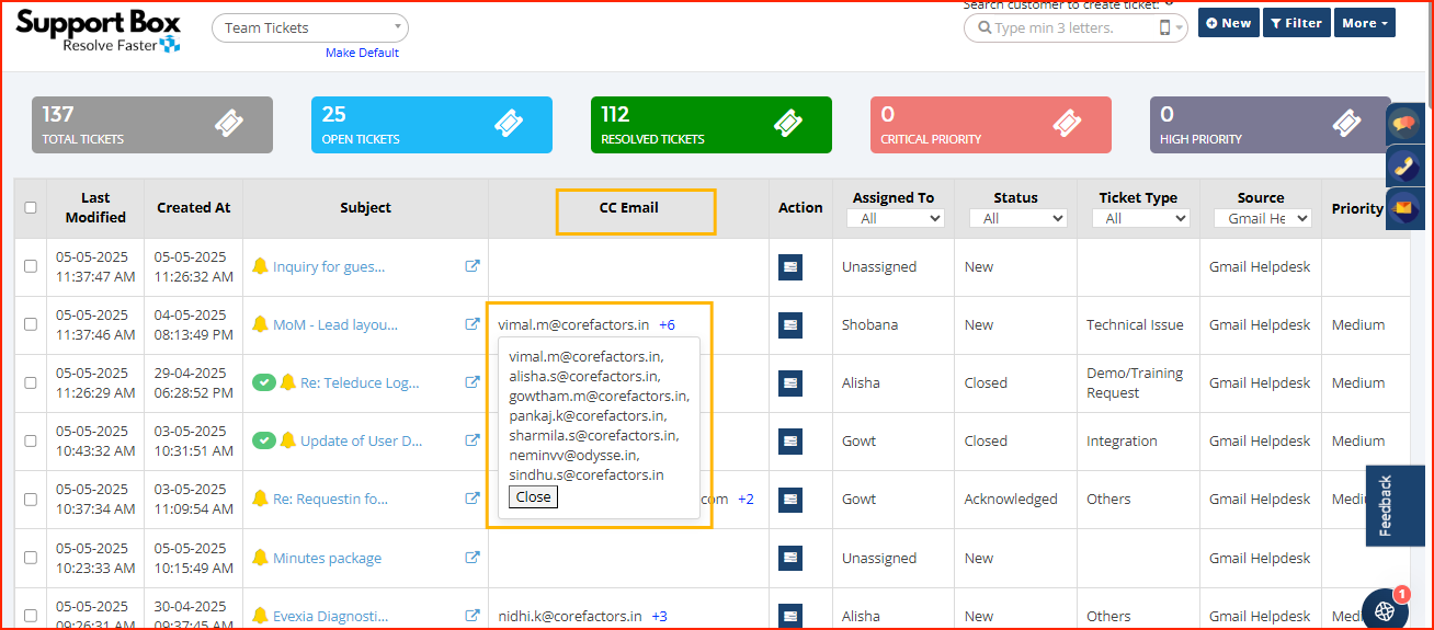 You can now view and filter by CC email addresses in Support Box tickets.